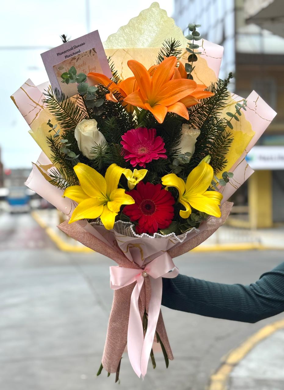 Compuesto por liliums en tonos naranjo y amarillo, gerberas fucsia y rojas, y delicadas rosas blancas que simbolizan pureza y amor. Un detalle perfecto para dar la bienvenida a un nuevo comienzo. (Flores según disponibilidad, pero se conserva los colores)