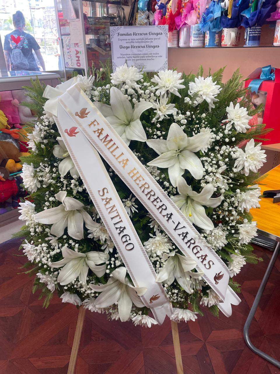 Su forma circular representa la eternidad del recuerdo y el amor que nunca se apaga. Corona confeccionada con liliuns y maules blancos, símbolo de paz y espiritualidad.