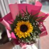 Ramo compuesto por un girasol protagonista, cuidadosamente envuelto en papel en tonos fucsia o rosa que realzan su energía y calidez. Un arreglo sencillo pero lleno de significado, ideal para regalar alegría, optimismo y cariño en cualquier ocasión especial.