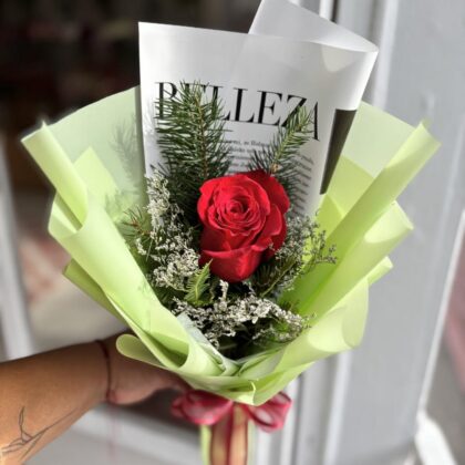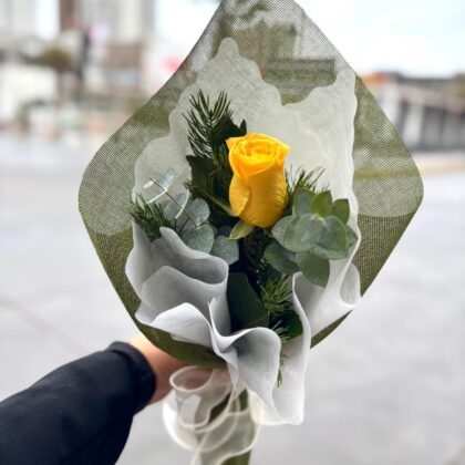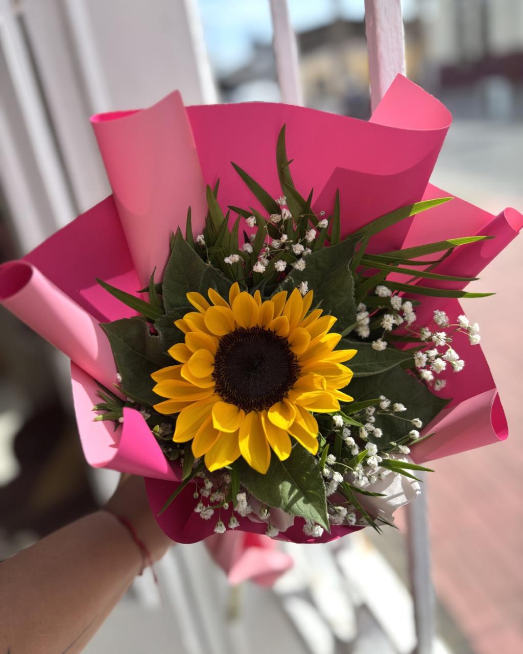 Ramo compuesto por un girasol protagonista, cuidadosamente envuelto en papel en tonos fucsia o rosa que realzan su energía y calidez. Un arreglo sencillo pero lleno de significado, ideal para regalar alegría, optimismo y cariño en cualquier ocasión especial.