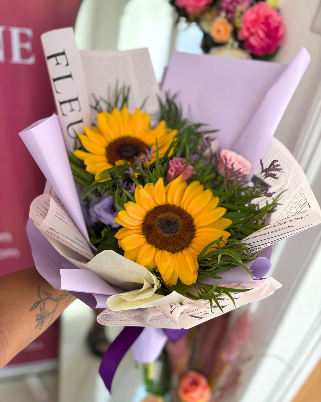 Ramo compuesto por dos girasoles acompañados de follaje fresco y flores de acento, envuelto en una presentación moderna en tonos suaves. Un detalle luminoso que transmite alegría, energía y un mensaje de cariño sincero, perfecto para sorprender en cualquier ocasión.