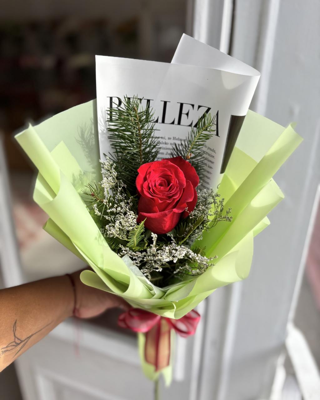Ramo compuesto por una rosa roja cuidadosamente envuelta en papel verde menta, creando un contraste fresco y elegante. Un gesto significativo para conmemorar el Día de la Mujer, celebrando valentía, amor propio y la importancia de su presencia en nuestras vidas.