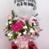 Arreglo floral romántico que combina rosas rosadas, hortensia fucsia, flores blancas y follaje verde. Acompañado de un globo burbuja con el mensaje “Mi lugar favorito es a tu lado” y una elegante caja de chocolates artesanales, complementado con pétalos decorativos. Ideal para aniversarios, celebraciones especiales o sorprender con un gesto inolvidable.