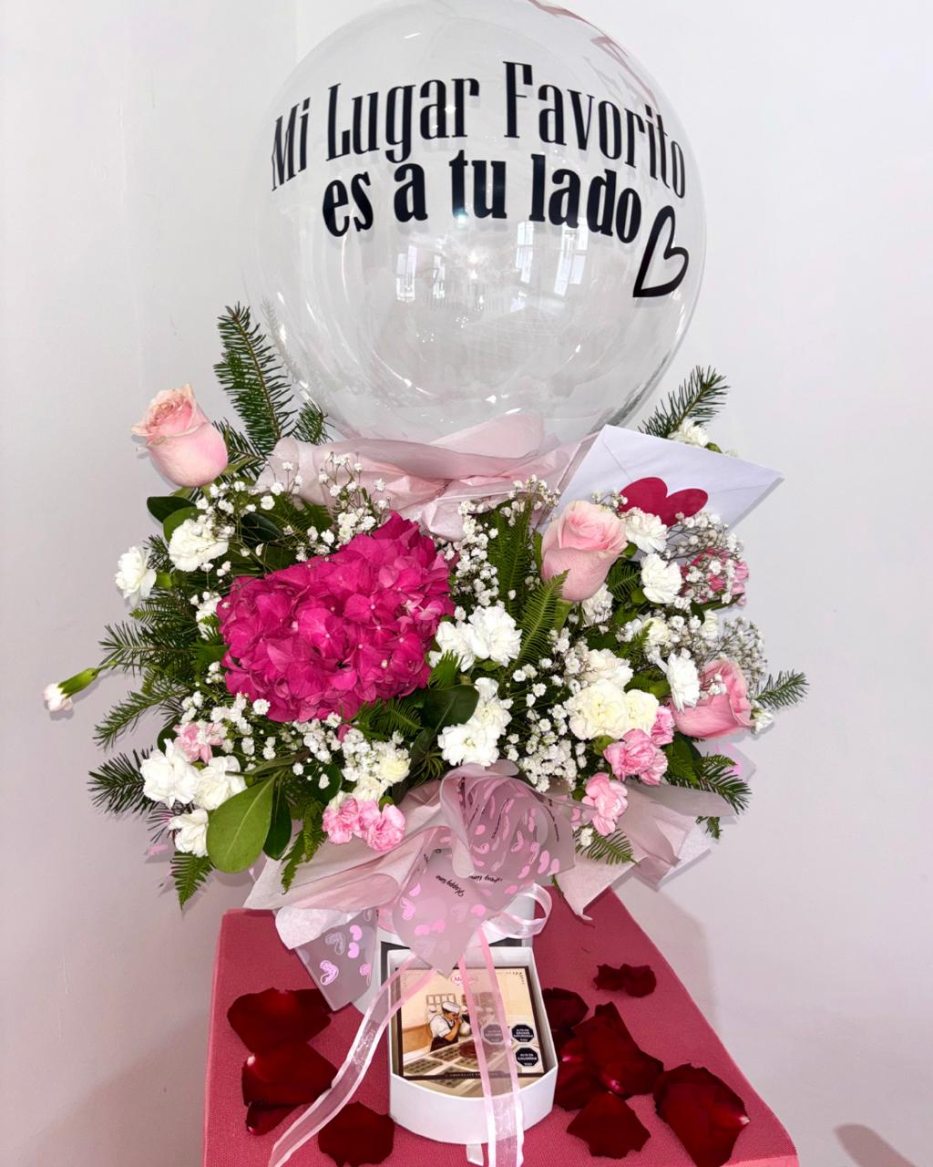 Arreglo floral romántico que combina rosas rosadas, hortensia fucsia, flores blancas y follaje verde. Acompañado de un globo burbuja con el mensaje “Mi lugar favorito es a tu lado” y una elegante caja de chocolates artesanales, complementado con pétalos decorativos. Ideal para aniversarios, celebraciones especiales o sorprender con un gesto inolvidable.