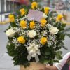 Arreglo en base rupestre con rosas amrillas y blancas acompañado de gypsophilia y follaje verde. Un homenaje luminoso y lleno de esperanza para despedir con amor y gratitud.