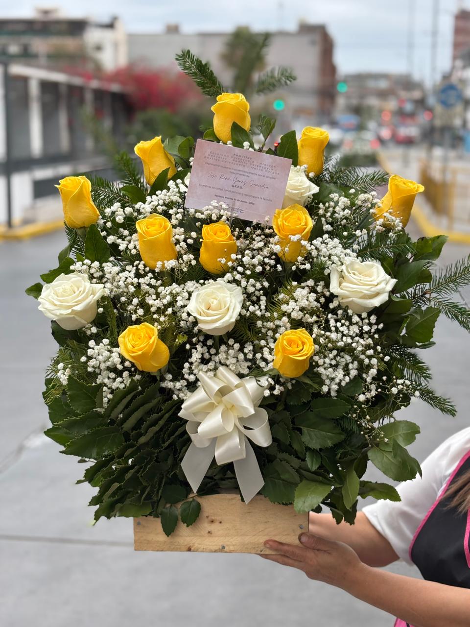 Arreglo en base rupestre con rosas amrillas y blancas acompañado de gypsophilia y follaje verde. Un homenaje luminoso y lleno de esperanza para despedir con amor y gratitud.