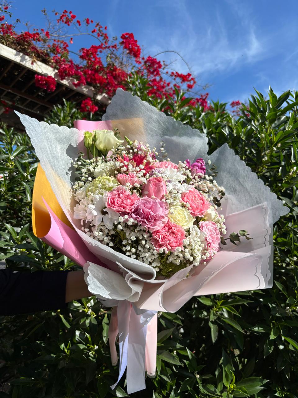 Un bouquet delicado y romántico en tonos rosa y blanco, compuesto por claveles, mini rosas, gypsophilia y gerberas. Perfecto para expresar cariño, dulzura y gratitud con elegancia.